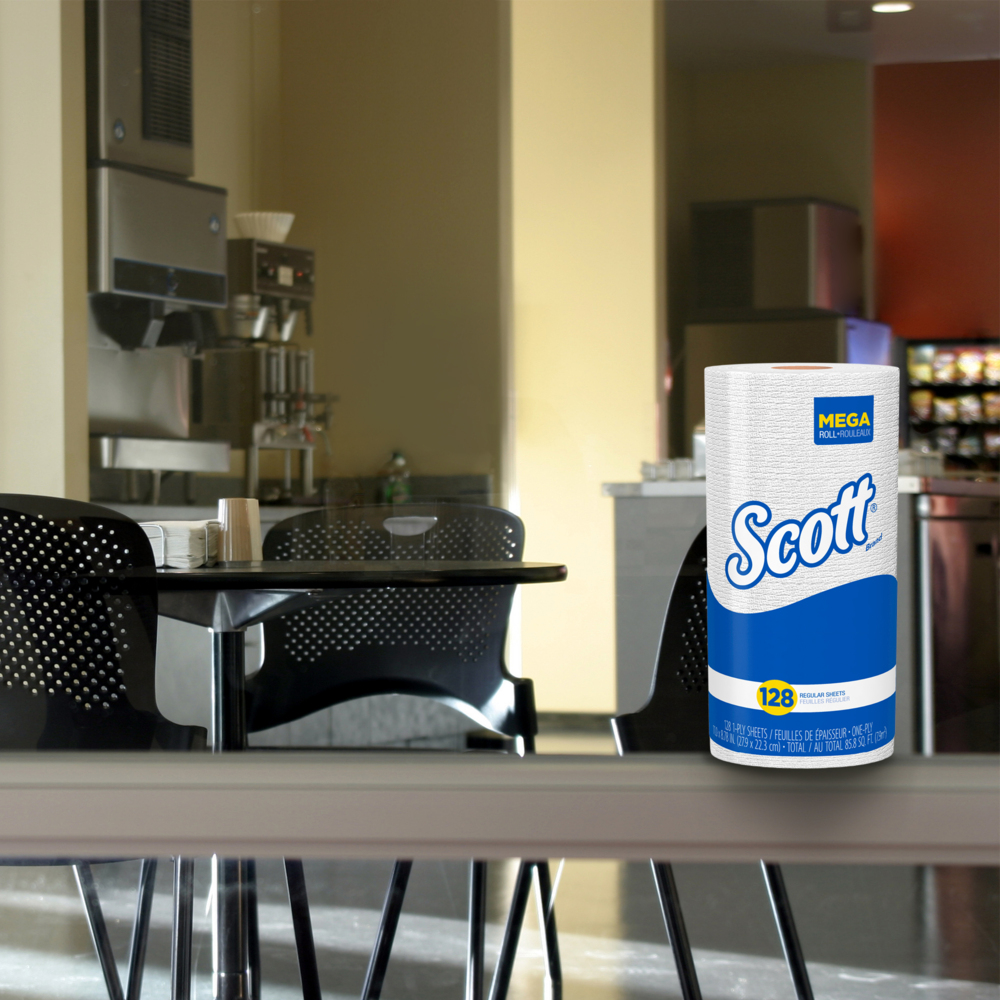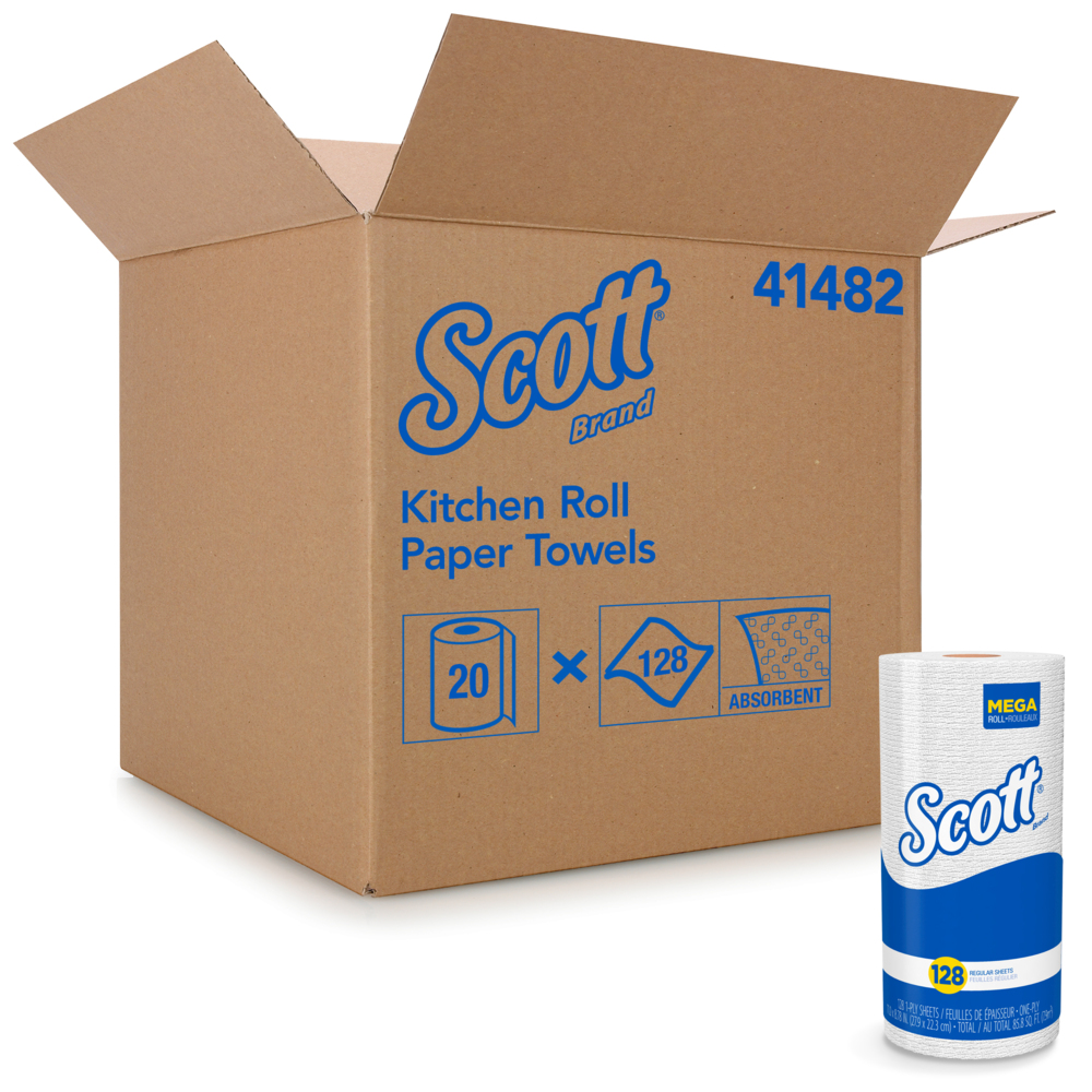 When you need an affordable kitchen paper towel for your break room, the Scott® Kitchen Paper Towels are a smart choice. Each of the paper towel rolls (20 per case) features 128 perforated towels. While they are single-ply kitchen paper, they feature fast-drying Absorbency Pockets which soak up water fast, so users need fewer towels to dry their hands and wipe up spills. The Scott® kitchen roll fits easily into standard roll towel dispensers – such as a countertop towel holder or a roll holder for under kitchen cabinets. By giving your employees and break room visitors what they need to dry their hands after proper washing, you're helping them stay clean and healthy. The paper towel rolls contain a mix of recycled fiber and post-consumer waste to meet EPA minimum guidelines for (kitchen tissue) paper towel products.